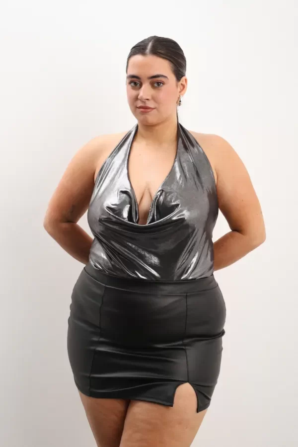 Body al cuello con escote buche, espalda abierta y broches en la parte baja. La tela foil le da un brillo metalizado suave. Ideal para salidas por la noche.