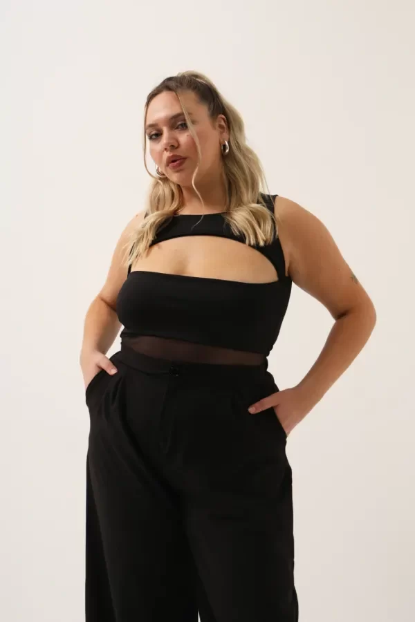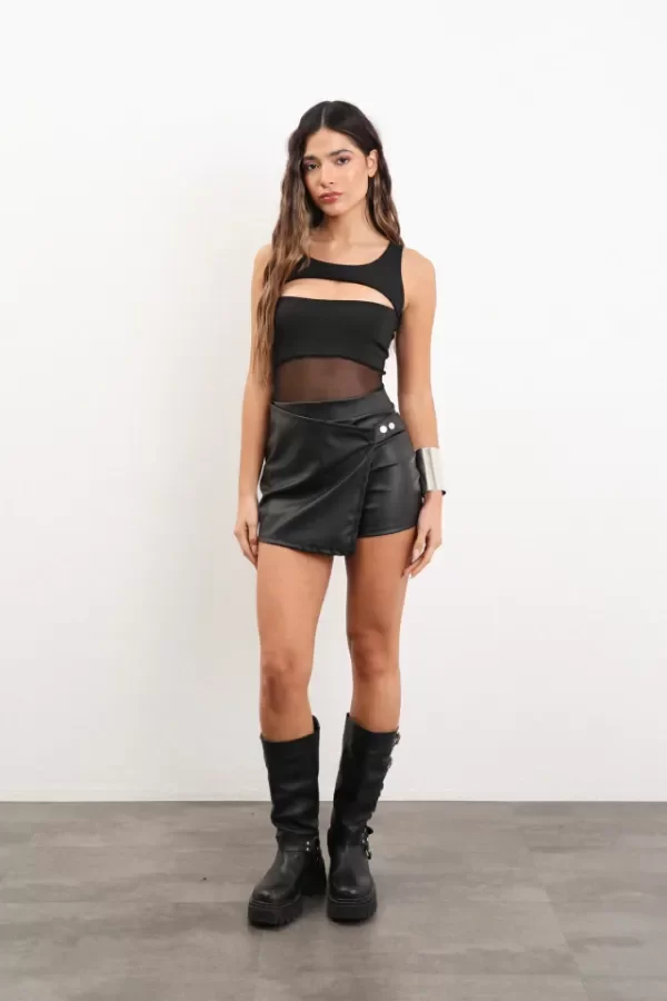 Body de lycra con sustracción en frente y recorte de tul. Cuenta con ganchitos para abrochar en la parte baja para que puedas sentirte mega cómoda al usarlo.