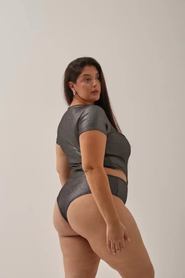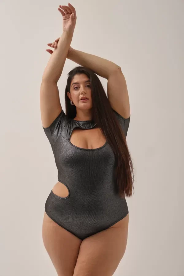 Body con mangas cortas, brilloso y con recortes. Tiene ganchitos para abrochar en la parte baja.