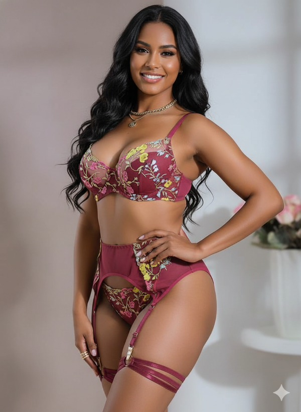 Conjunto importado que consta de less, corpiño, portaliga y ligueros.